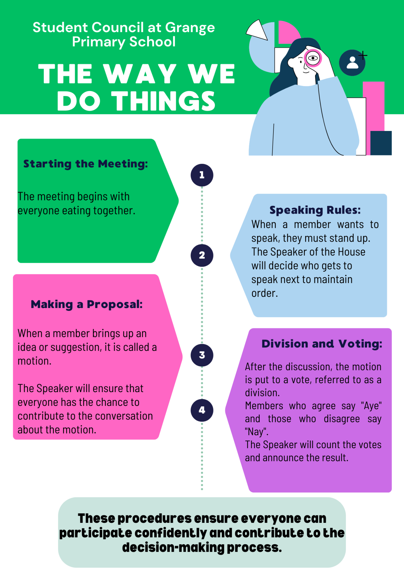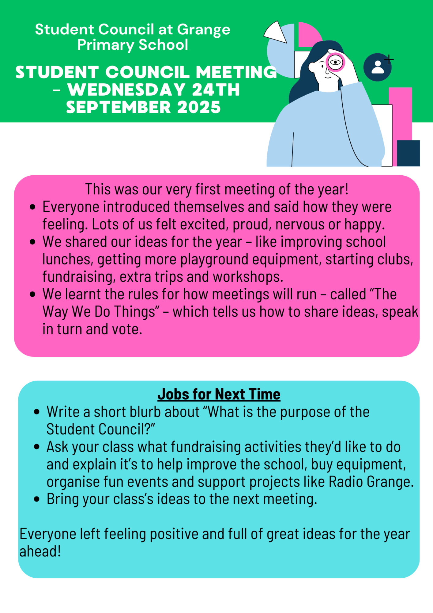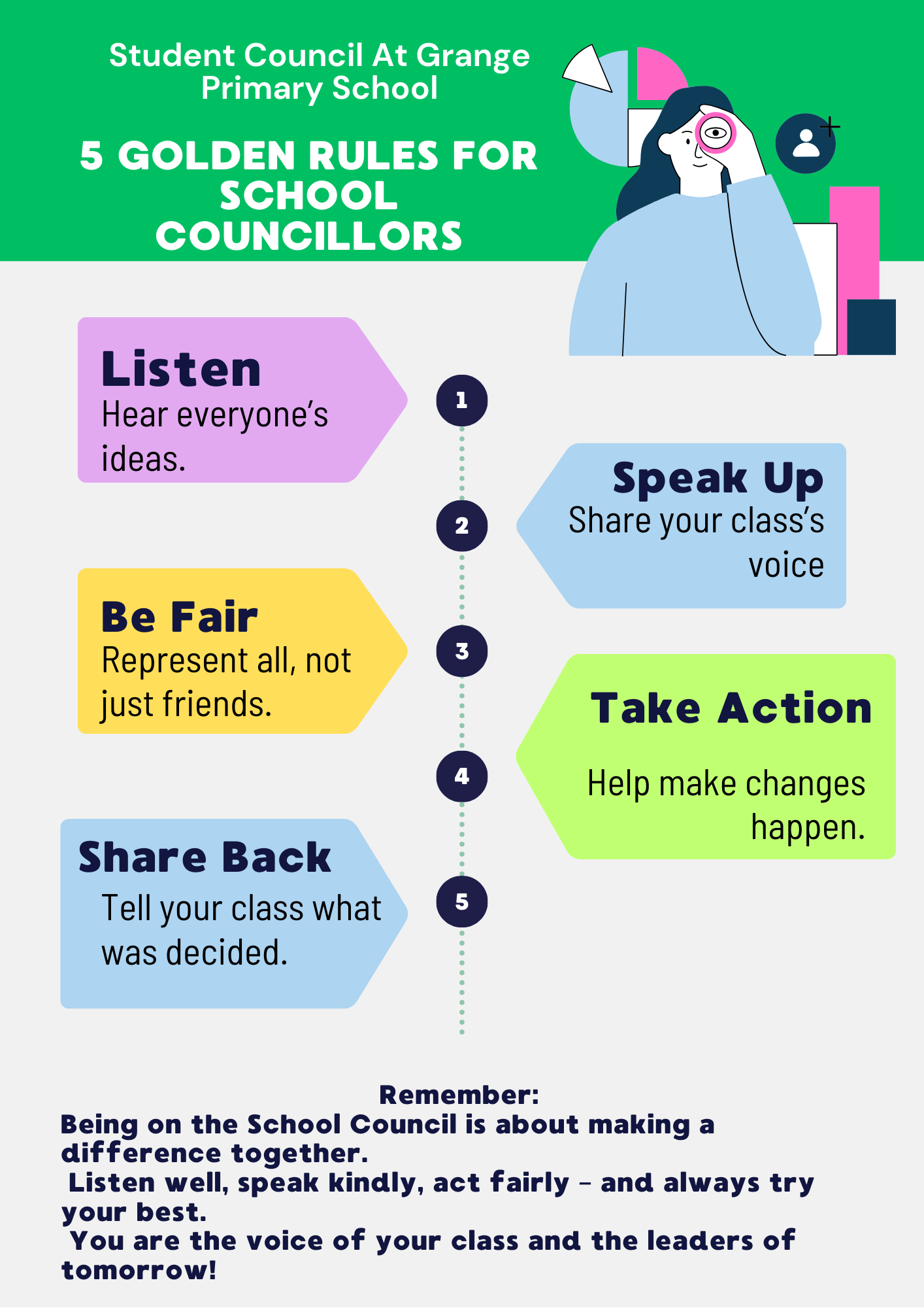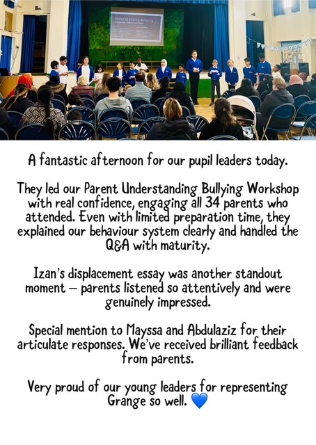 Our Student Council works hard to represent pupil voice across the school. They share the ideas of their classmates, help to make decisions, and plan projects such as improving playtimes, supporting special events and thinking of ways to make Grange even better for everyone.